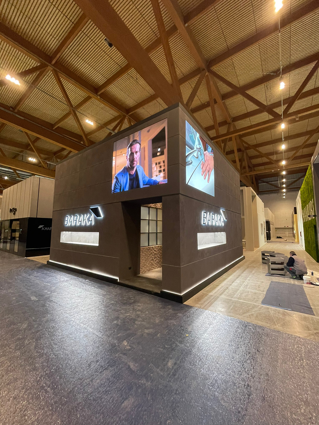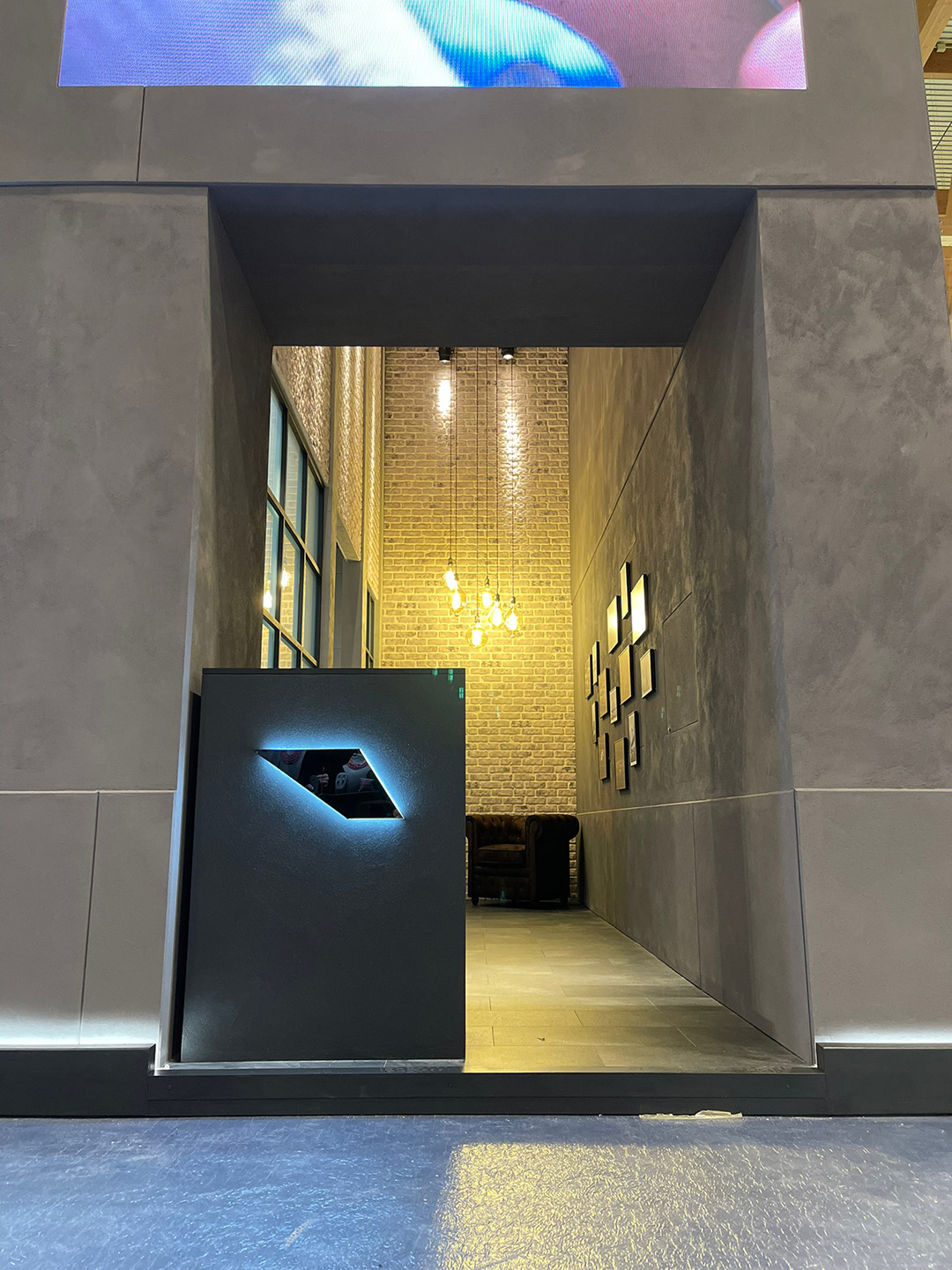 Ogni dettaglio dello stand è stato curato con precisione, garantendo un design di alto livello. La parete in mattoni è solo un esempio dei materiali di qualità utilizzati per creare un’atmosfera distintiva.