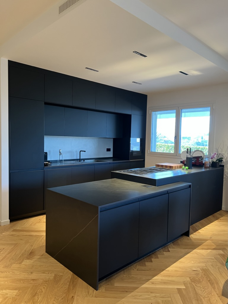 Nelle colline di Vicenza, abbiamo portato a termine una ristrutturazione completa, seguendo ogni minimo dettaglio. Uno dei punti focali di questa proposta è la cucina, realizzata in fenix nero. Questa scelta conferisce alla cucina una sofisticata bellezza e una durabilità. Le tonalità scure del fenix aggiungono profondità e calore all’ambiente, creando un contrasto affascinante con gli altri elementi d’arredo.
